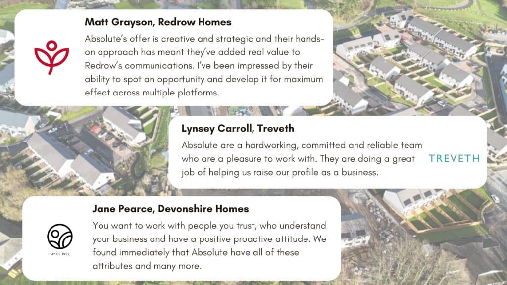 For over two decades, Absolute PR & Marketing has partnered with developers, housebuilders, architects, construction companies, and agents across the South West to deliver strategic, creative and results-driven communications for the built environment. From the earliest stages of planning and public consultation through to full development launches and ongoing site sales support, we help shape narratives, engage communities, and generate the visibility and interest developments need to succeed.